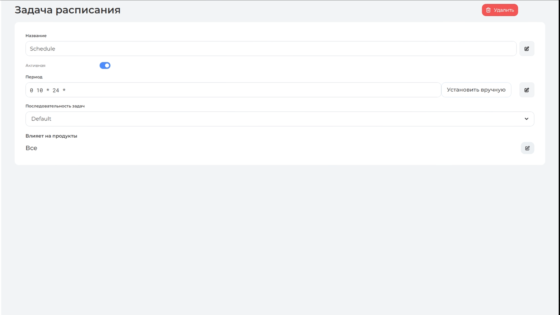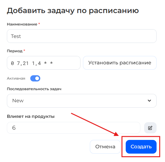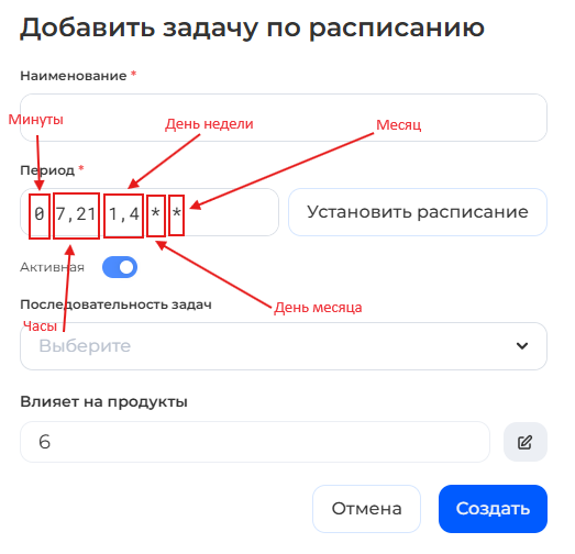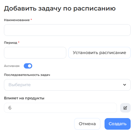 3. В открывшемся окне заполните следующие поля: **Название**, **Crontab**, **Цепочка заданий**, **Затрагиваемые продукты**\