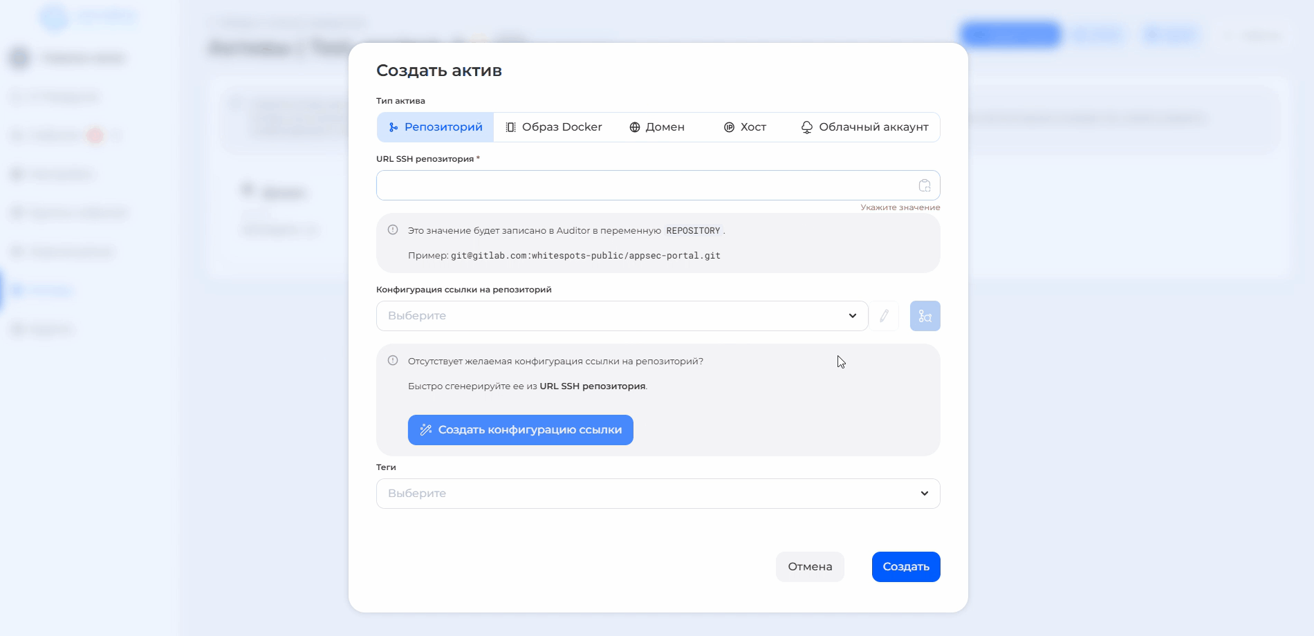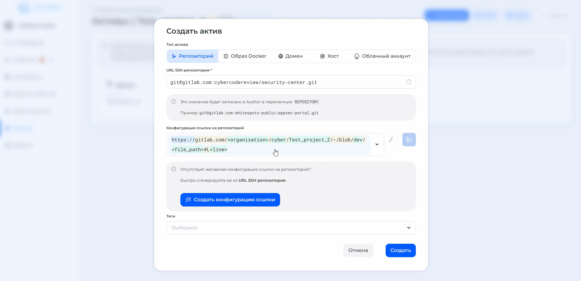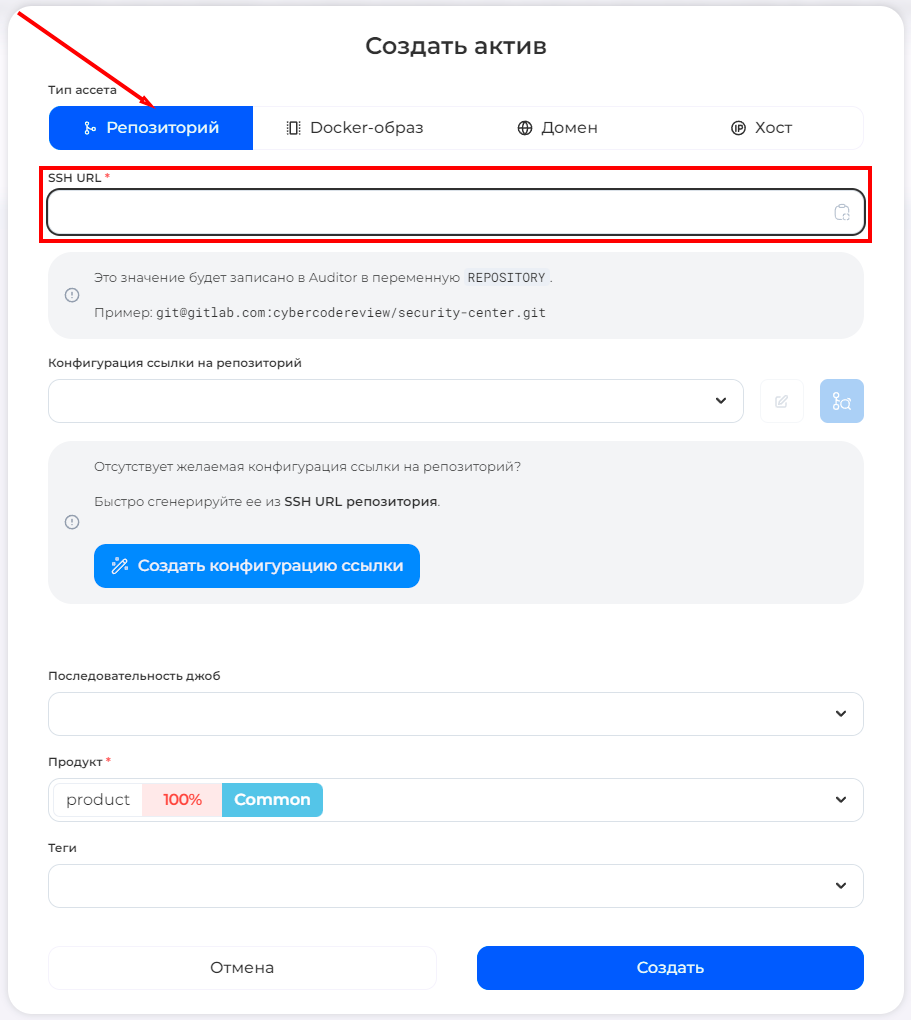 1. **SSH URL адрес репозитория**: введите адрес вашего репозитория в определенном формате, например: <git@gitlab.com>:cybercodereview/security-center.git