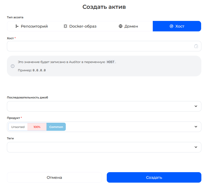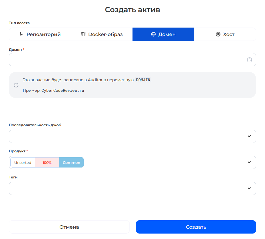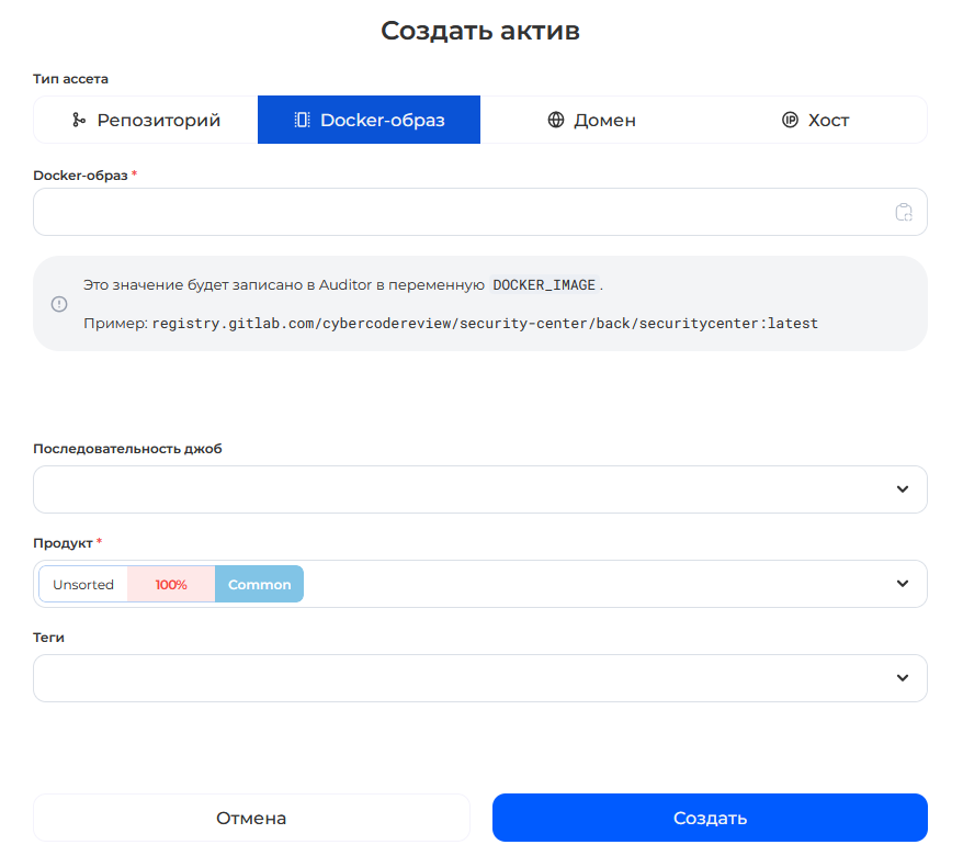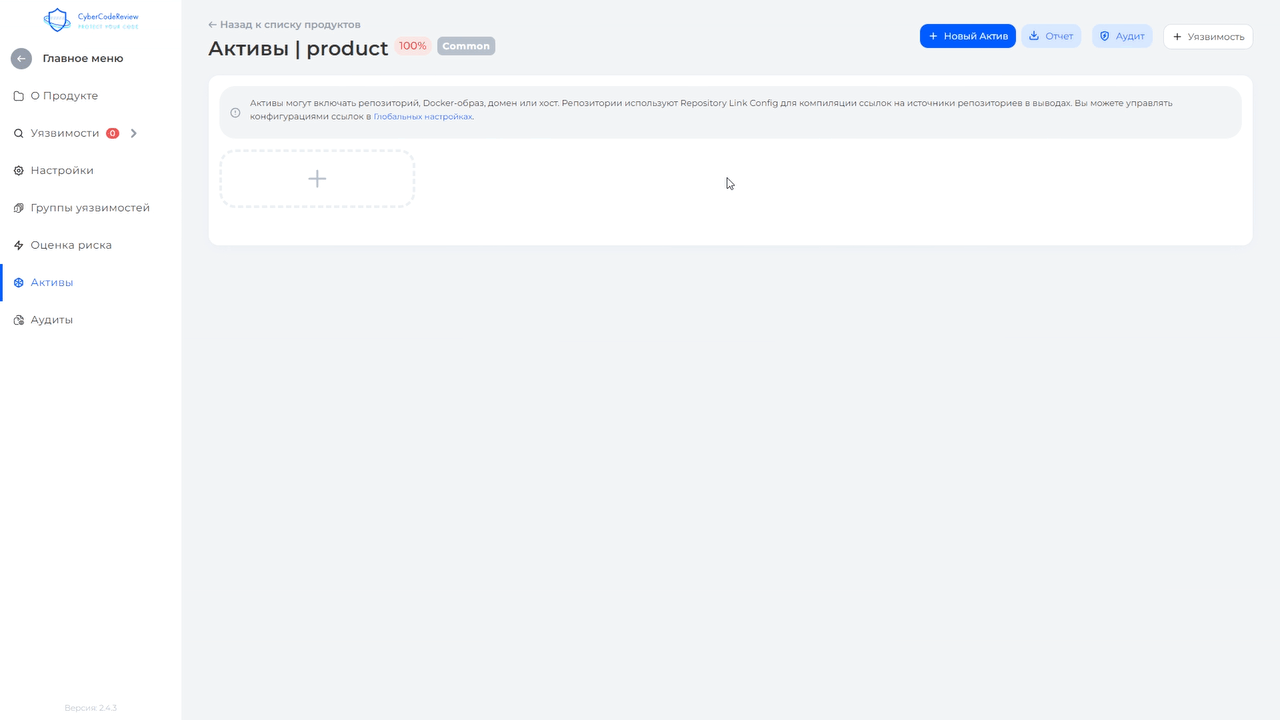 Если продукт уже [создан](https://docs.cybercodereview.ru/security-center/general-portal-settings/product-settings), добавьте данные о его активе. Для этого выберите пункт ***Активы*** на странице продукта