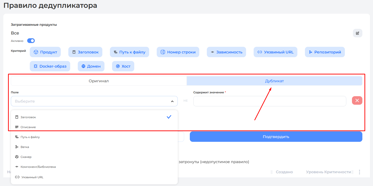 3. Выберите один или несколько **критериев идентичности** оригинальных и дублирующих обнаружений: