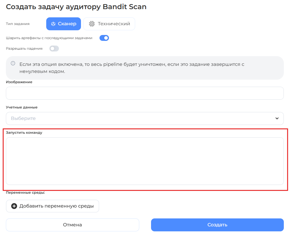 * **Переменные окружения**: указываются переменные окружения, которые будут использоваться заданием\