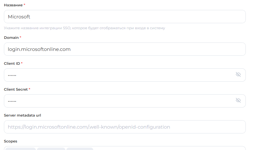 <figure><img src="https://630546901-files.gitbook.io/~/files/v0/b/gitbook-x-prod.appspot.com/o/spaces%2F31dcCQWMOu1AiZEAFiOT%2Fuploads%2FCbISGfydoxZ0Xd9uAlSM%2F118-5.png?alt=media&#x26;token=7c352429-3dca-4c31-bfea-557cf7ce8e4b" alt=""><figcaption><p>Пример значений Microsoft SSO</p></figcaption></figure>
