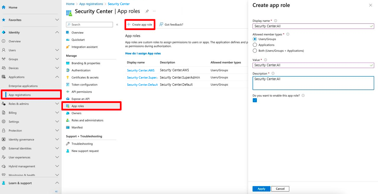 Перейдите в раздел **Applications** -> **App registrations** -> <***Созданное приложение***> -> **App roles** и создайте здесь все необходимые роли