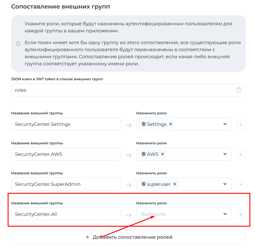 3. [Настройте ](https://docs.cybercodereview.ru/security-center/general-portal-settings/sso-settings/..#role-mapping)сопоставление ролей для вашего SSO-соединения.\