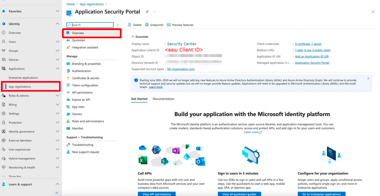 3. Вы увидите следующее окно, в котором нужно скопировать содержимое строки Application (client) ID: