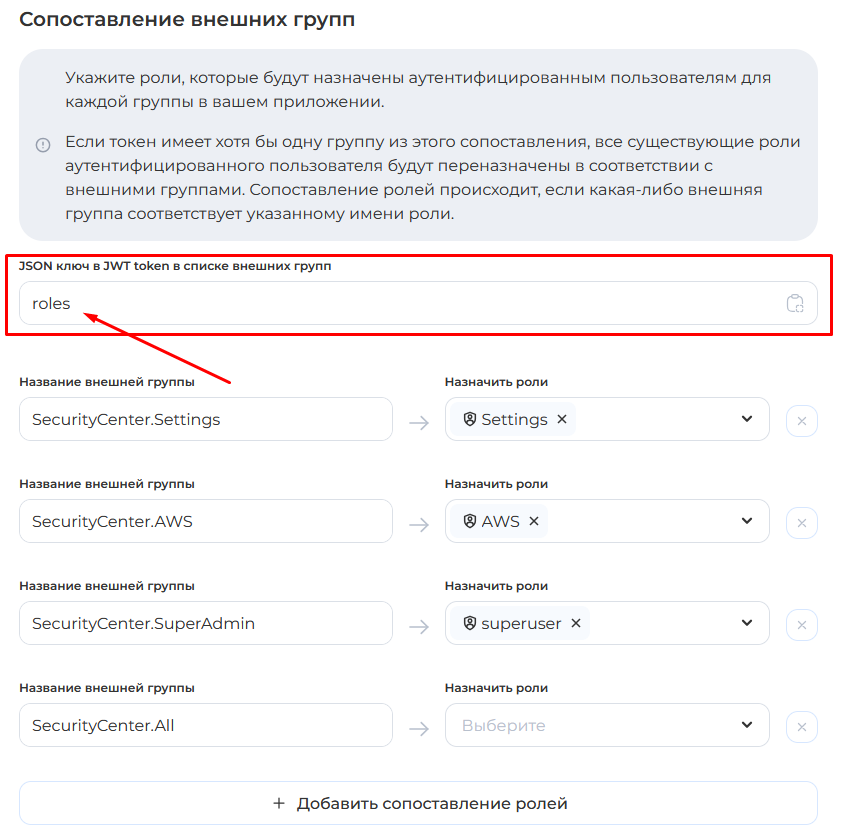 Поле "**JSON-ключ в JWT-токене со списком внешних групп"** должно быть равно роли для этой интеграции.