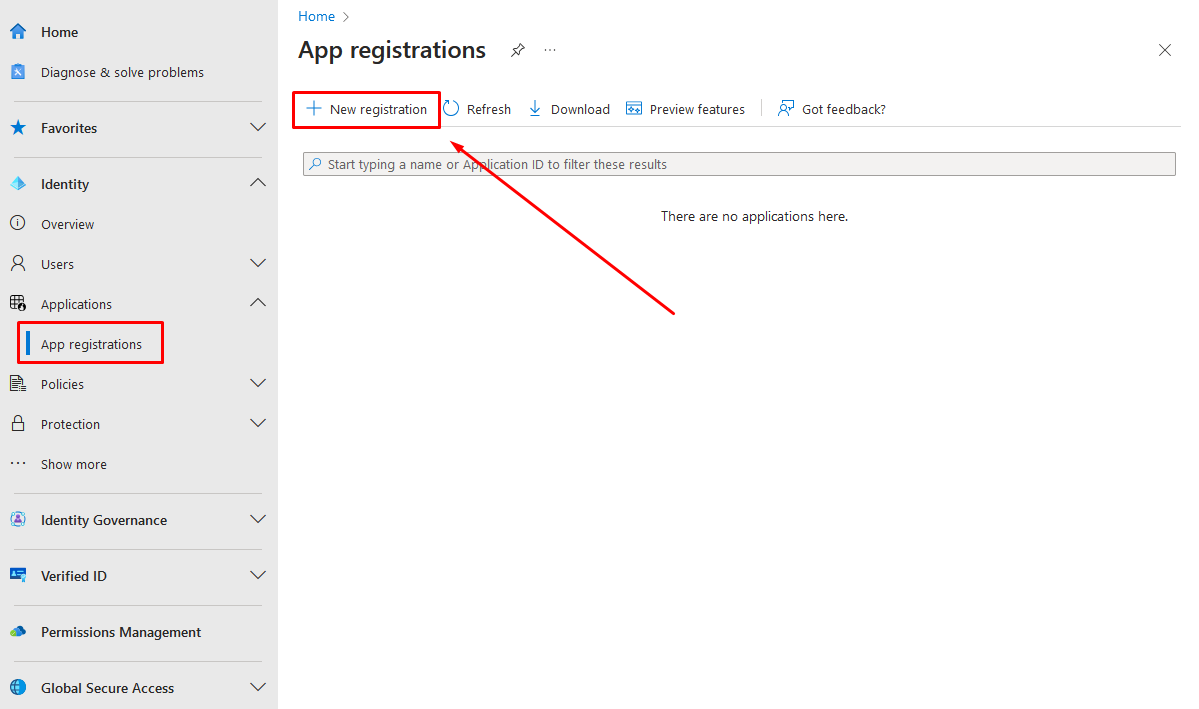 2. Перейдите в  раздел **Application** -> **App registrations** и **зарегистрируйте новое приложение**